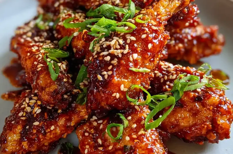 - Toss and Garnish: Once cooked, transfer hot, crispy wings to a large clean bowl. Pour the warm glaze over the wings and toss gently until every piece is coated. Garnish immediately with toasted sesame seeds and sliced green onions before serving.