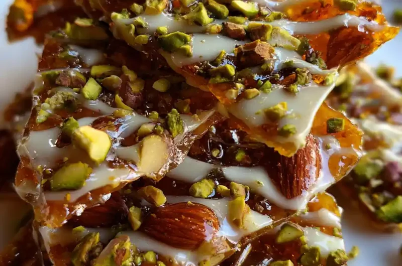 6. Cool & Break: Let the almond brittle cool completely at room temperature for 30-45 minutes until hard to the touch. Break into irregular pieces. (Optionally, drizzle melted white chocolate and sprinkle chopped pistachios for a beautiful finish.)