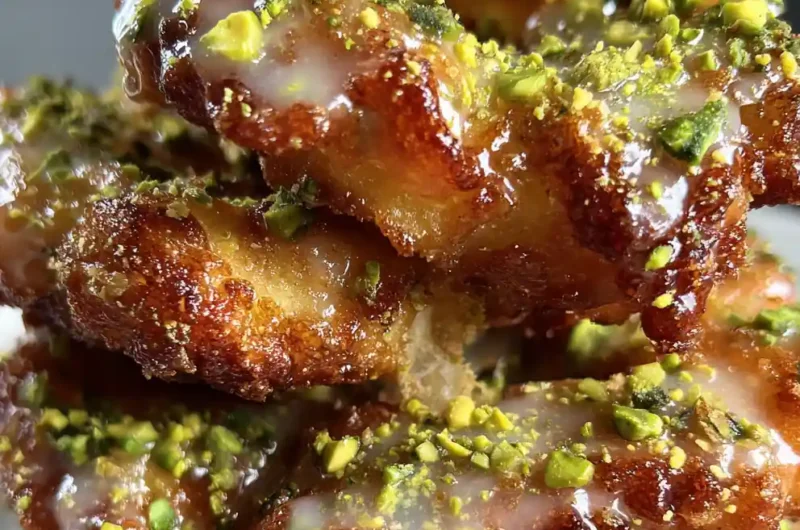 - Glaze While Warm: While the fritters are still warm, prepare the glaze: In a medium bowl, whisk together 200g / 1 ½ cups powdered sugar, 30ml / 2 tablespoons whole milk, 5ml / 1 teaspoon alcohol-free rosewater, and 0.5g / ¼ teaspoon ground green cardamom until smooth and lump-free. Dip each warm fritter into the glaze, turning to coat evenly, then return to the wire rack to allow excess glaze to drip off. Immediately sprinkle the finely chopped pistachios generously over the top of each glazed fritter before the glaze sets for that beautiful Pistachio Crunch.