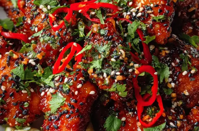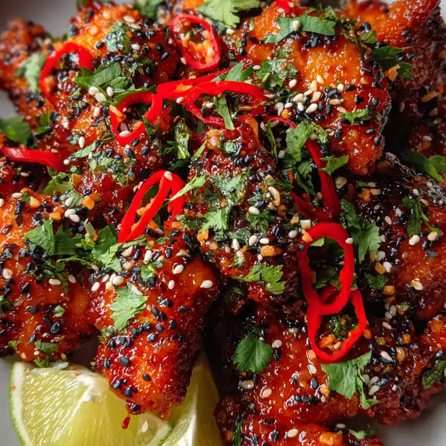 6. Plate & Garnish: Arrange chicken, spoon sauce, and garnish with sesame seeds, cilantro, chili, and lime wedges.