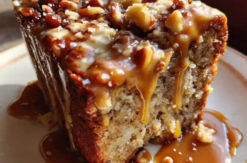 - Cool and Serve: Let the banana bread cool in the pan for 15 minutes to allow the structure to set before handling. Use the parchment paper overhang to lift the loaf out and transfer it to a wire rack to cool completely. Slice into thick pieces; for plating, reheat any remaining salted caramel slightly and drizzle over each slice, then sprinkle with the extra toasted chopped walnuts or pecans. Enjoying this **best banana nut bread recipe** warm with extra sauce is highly recommended.
