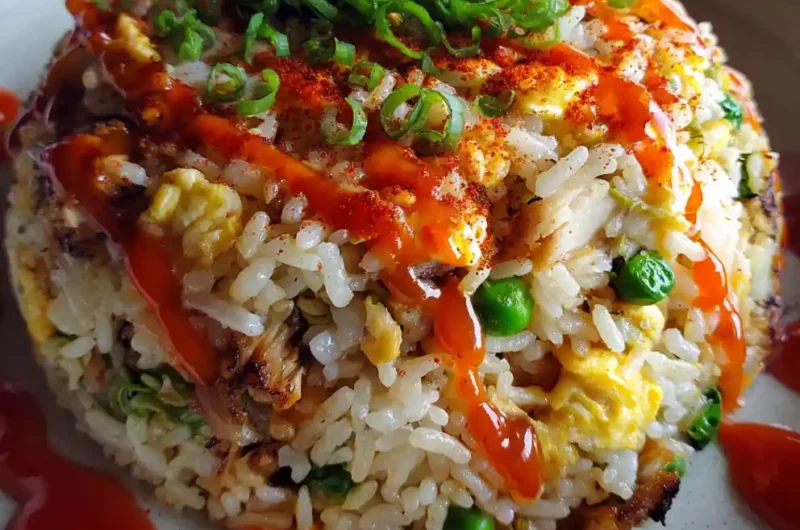 A vibrant chicken fried rice recipe featuring tender chicken thighs, crispy day-old rice, and a unique smoky roasted red pepper drizzle, offering a high-protein alternative to takeout.