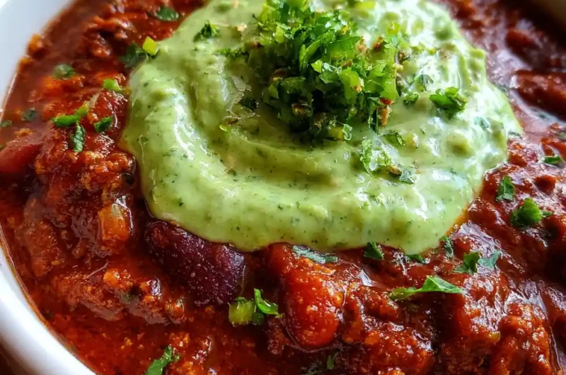 This classic chili recipe is a comforting, hearty meal featuring a rich tomato base, ground beef, and beans, topped with a bright, tangy green crema. It’s an easy-to-make, crowd-pleasing dinner perfect for busy families.