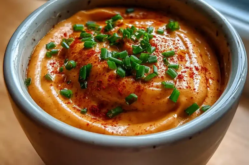 - Garnish for Serving: Spoon the chilled sauce into a small dipping bowl. Garnish with a light dusting of smoked paprika and sprinkle with fresh chopped chives.