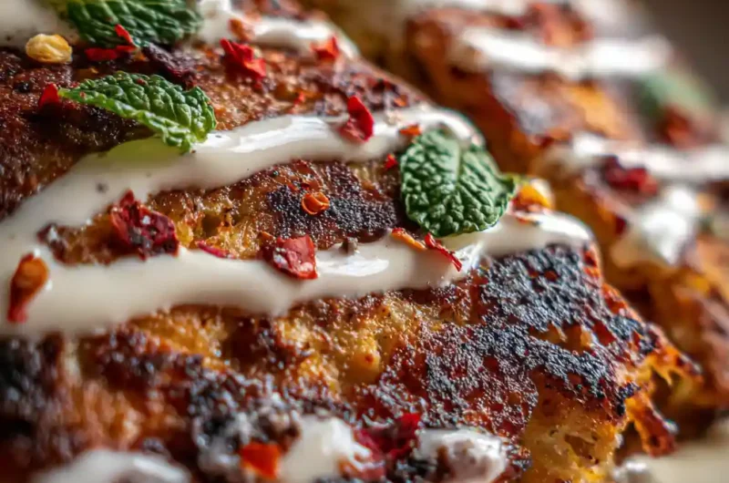 - Serve Warm: Transfer cooked cabbage patties to a wire rack set over a baking sheet to drain any excess oil, keeping them crispy. Arrange 3-4 golden-brown patties on a plate. Drizzle a generous zig-zag pattern of the minted yogurt sauce over them. Garnish by scattering a pinch of additional Aleppo pepper flakes and a few small, fresh mint leaves over the sauced patties.