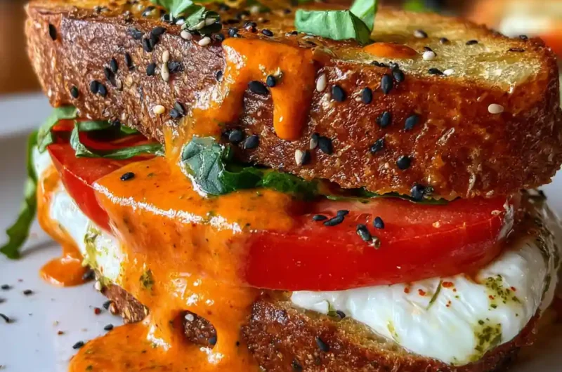 This recipe delivers a quick, fresh caprese sandwich featuring juicy tomatoes, creamy mozzarella, and aromatic basil on crisp, toasted bread. It’s an easy, healthy, and family-friendly meal perfect for busy schedules, enhanced with a unique roasted red pepper and za’atar drizzle.