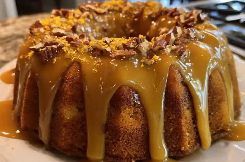 - Glaze & Garnish: Drizzle warm glaze over cooled cake and garnish with pecans and orange zest.