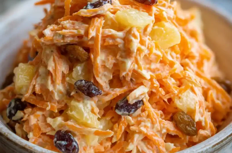 This vibrant carrot raisin salad with pineapple and orange ribbon is a sweet, tart, and crunchy side dish, perfect for quick, healthy family meals. It offers a refreshing citrus scent and brightens any table.