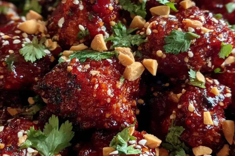 - Finish and Serve: Remove from the oven and let cool for a few minutes to allow the glaze to set. To plate, arrange the glossy, deep red cauliflower wings on a serving platter. Scatter the vibrant green 15g (1/4 cup) chopped cilantro unevenly over the top, allowing some to fall between the pieces. Sprinkle the 50g (1/2 cup) toasted peanuts and 10g (2 tsp) white sesame seeds generously, focusing on creating clusters and scattered textures for visual contrast.