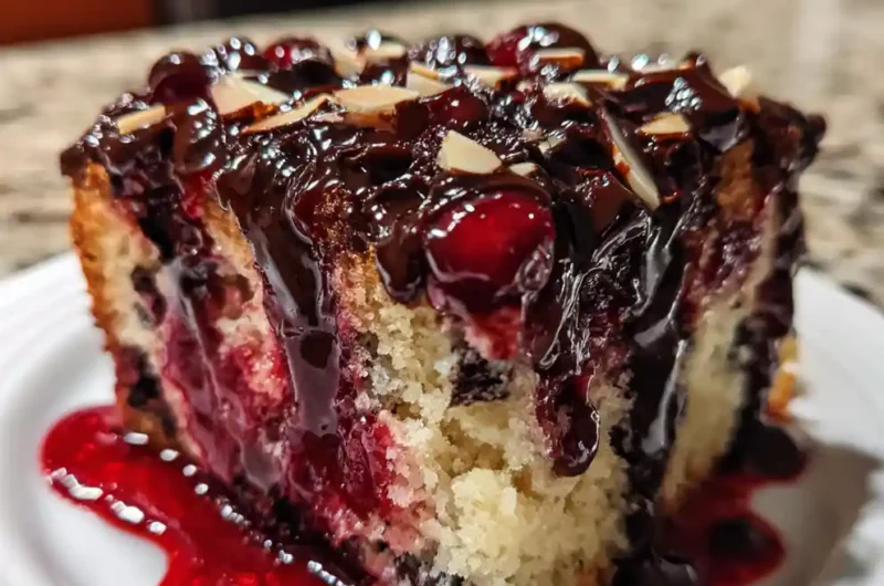 This Cherry Chocolate Chip Poke Cake is a stunning dessert featuring a moist, cherry-studded cake infused with a rich dark chocolate ganache, topped with a vibrant cherry glaze and toasted almonds. Perfect for celebrations or a luxurious treat!