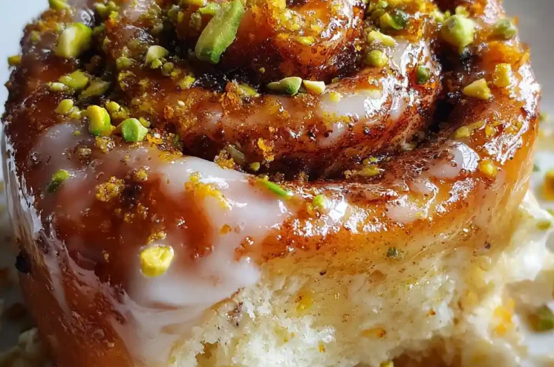 10. Glaze and Serve (5 minutes): While the rolls are still warm, whisk together 240 g (2 cups) sifted powdered sugar, 30 ml (2 tbsp) fresh orange juice, 15 ml (1 tbsp) orange blossom water, and 30-45 ml (2-3 tbsp) milk/cream until smooth for the glaze. Pour generously over the warm cinnamon rolls, then immediately scatter 30 g (¼ cup) chopped toasted pistachios and 5 g (1 tbsp) fresh orange zest. Serve these fragrant cinnamon rolls warm directly from the pan for the best experience.