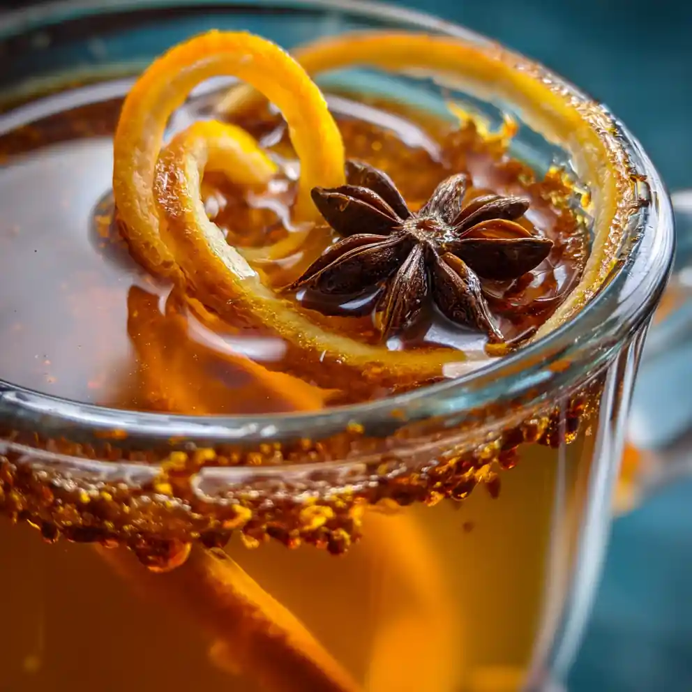 - Garnish and Serve: Drizzle 2 teaspoons of date syrup in a spiral inside a heat-resistant glass mug. Pour the strained tea, then float a thin ribbon of candied orange peel and nestle a star anise pod beside it for garnish.