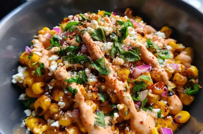 - Finish and Serve: Pour about half of the prepared Smoky Chipotle-Lime Crema over the corn mixture and toss gently to coat. Transfer to a serving platter, drizzle with the remaining crema, garnish with reserved cilantro, and serve immediately or at room temperature.