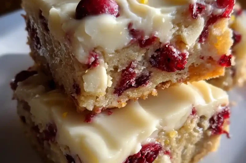 These white chocolate cranberry squares are a delightful treat featuring a tender bar base studded with white chocolate chips and tangy dried cranberries, topped with a creamy, zesty cream cheese frosting.