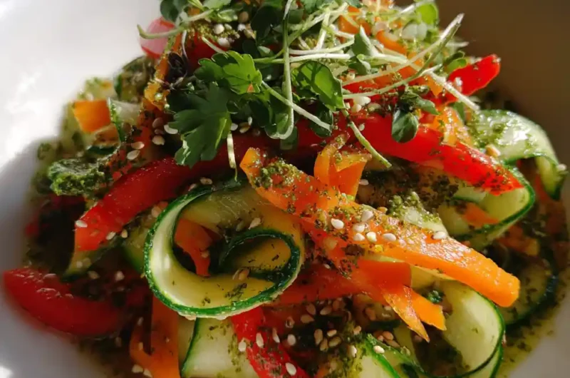 - Combine and Coat: In a large salad bowl, combine the prepared cucumber ribbons, carrot matchsticks, and bell pepper strips. Pour the creamy Asian dressing over the vegetables, ensuring everything is evenly coated. Toss gently to avoid bruising the delicate cucumbers.