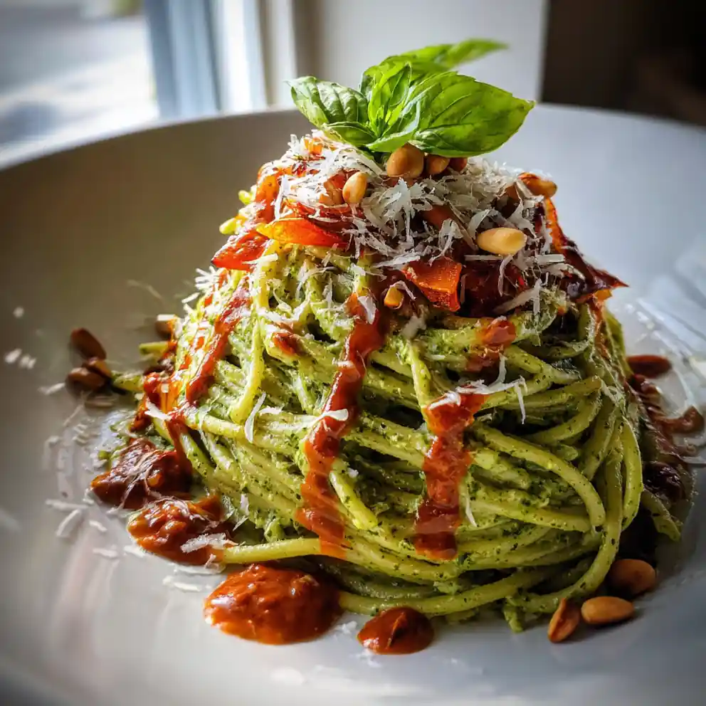 - Plate beautifully: Serve the pesto-coated pasta in shallow bowls to highlight the colors. Drizzle generous ribbons and swirls of the roasted red pepper sauce directly over the pasta for a striking contrast. Garnish with reserved Parmesan, toasted pine nuts, and fresh basil leaves for a restaurant-quality finish.