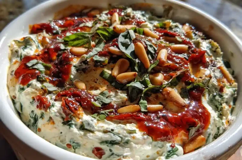 - Garnish and Chill: Scatter the toasted pine nuts evenly over the top of the dip. Place the torn basil leaves artfully around the dip. Finish with a light drizzle of extra-virgin olive oil for a beautiful sheen. Refrigerate for at least 30 minutes to allow the flavors to meld and the swirls to set.