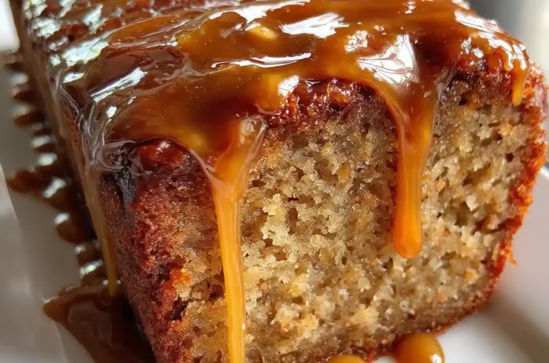 8. Drizzle and Serve (2 minutes): Let the caramel cool slightly (about 5 minutes) so it thickens further. Pour the warm caramel evenly over the cooled easy moist banana cake recipe. The caramel should drip enticingly down the sides.