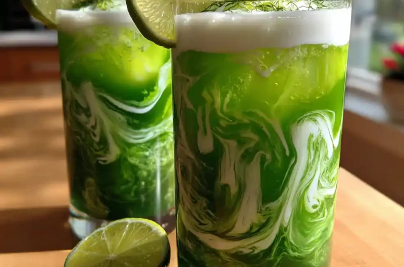 - Assemble and Serve: Pour the chilled green kale tonic into two tall glasses. Gently drizzle the coconut-lime swirl mixture over the top surface of each drink. Use a small spoon or skewer to create light swirls or ribbons. Garnish with a lime wheel on the rim and extra lime zest. Serve immediately.