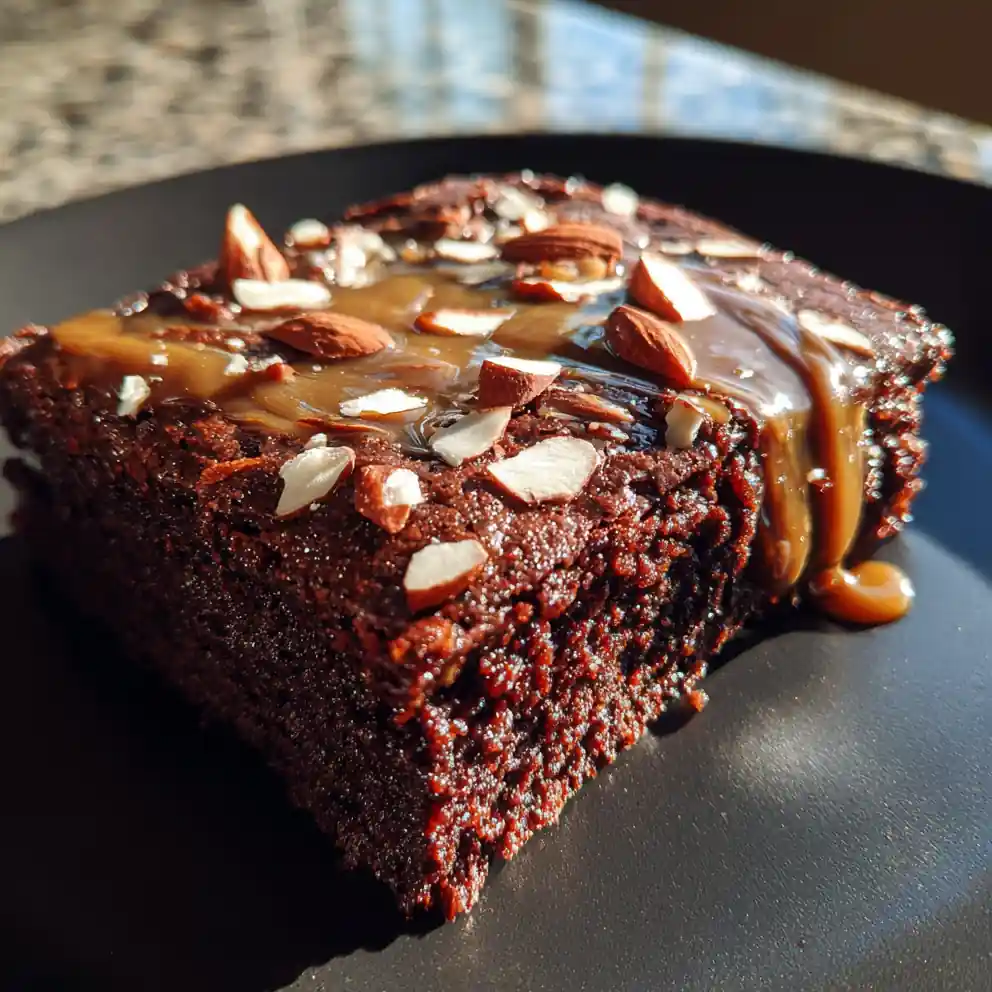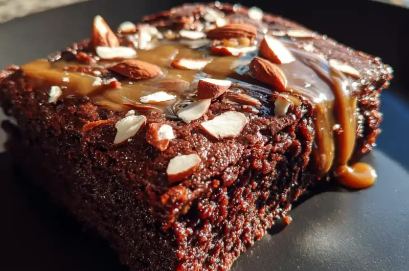- Cool & Finish: Cool in pan for 10 minutes, then lift out with parchment. Drizzle with ganache and sprinkle with almonds.