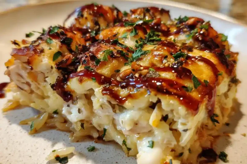 This French Onion Chicken Orzo Casserole features tender chicken and delicate orzo in a savory broth, topped with caramelized onions and a vibrant pomegranate glaze. It’s a comforting and flavorful dish perfect for a weeknight meal or special occasion.