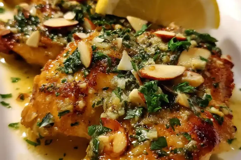 - Plate & Garnish: Plate chicken, drizzle with sauce, and garnish with lemon and almonds.