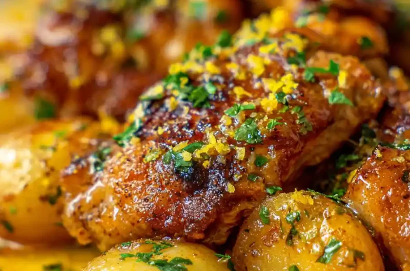 5. Assemble the Dish: Arrange the seared chicken pieces on top of the potatoes. Pour the low-sodium vegetable broth and fresh lemon juice over the chicken and potatoes. Finally, pour the garlic-butter mixture evenly over everything. The lemon juice adds a bright acidity that balances the richness of the Parmesan and butter.
