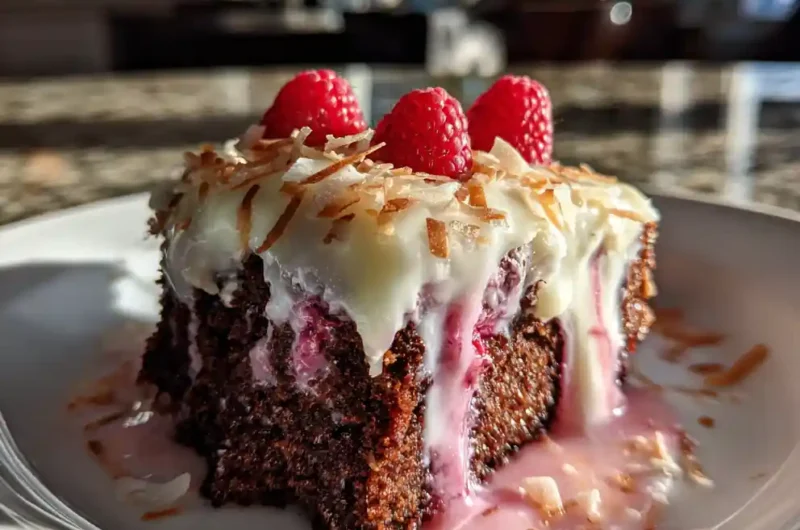 Indulge in a moist and flavorful German Chocolate Poke Cake with a vibrant raspberry ribbon and toasted coconut. This classic dessert is elevated with a delightful textural contrast and bursting with chocolatey goodness.