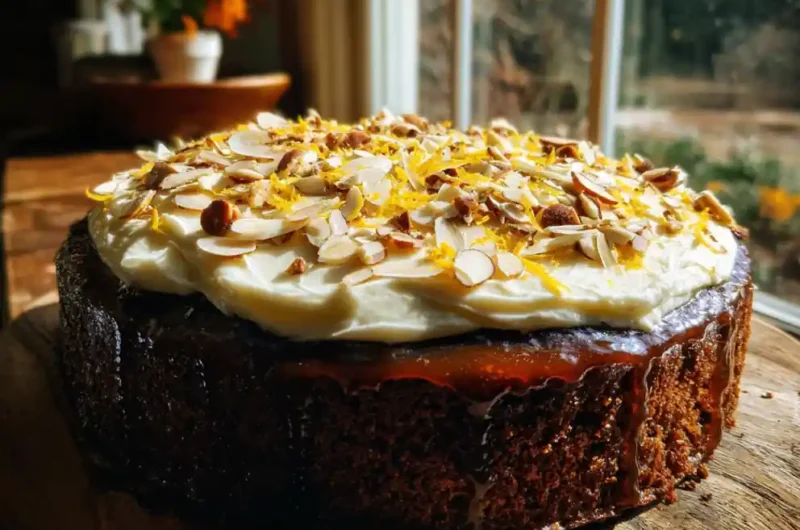 - Assemble and Garnish: Place the cooled cake on a serving plate. Drizzle the orange-zest glaze over the top, allowing it to pool at the edges. Spread the cinnamon-molasses cream cheese frosting evenly over the glazed cake. Finish with a final drizzle of glaze, extra orange zest, and toasted almond slivers (if using).