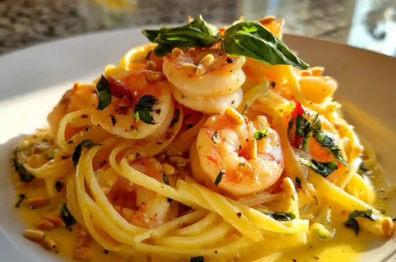 8. Finish & Serve: Fold in shrimp, drizzle with lemon-basil oil, and garnish with pine nuts and basil.