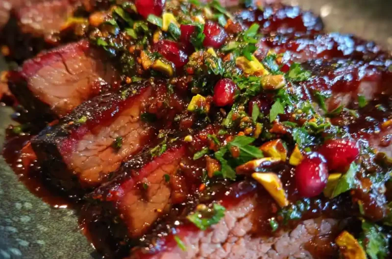 6. Prepare Glaze & Gremolata: While the brisket rests, prepare the Date-Tamarind Glaze: In a 2-quart saucepan, combine dates, tamarind paste, apple cider vinegar, honey, water, 0.5 tsp smoked paprika, and 0.5 tsp ground cumin. Bring to a simmer, then reduce heat and cook 15-20 minutes, stirring, until dates are very soft and the mixture has thickened, coating the back of a spoon. Blend until smooth. For the Vibrant Gremolata: Lightly toast pistachios in a dry pan for 3-5 minutes until fragrant, then cool and chop. Combine with chopped fresh mint leaves and pomegranate seeds.