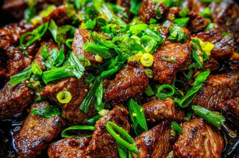 - Finish and Serve: Return all steak to the pan, tossing to coat in the shimmering sauce. Stir in 2 Tbsp of ginger-garlic butter until it melts and creates a glossy coating. Scatter with 0.5 cup (20g) chopped scallions and serve immediately.