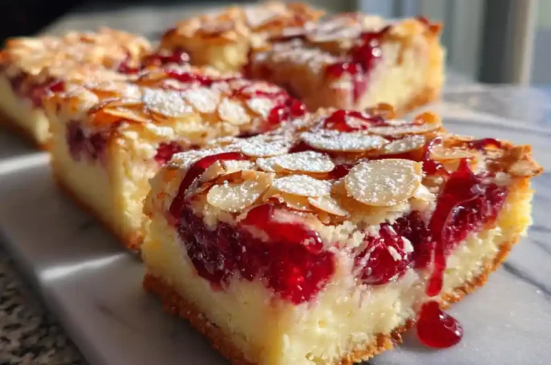 10. Final Touches: Once the cake is completely cool, lightly dust the top with powdered sugar. Scatter the toasted almond slices over the powdered sugar for added texture and flavor. If desired, drizzle any remaining raspberry glaze in a thin line across the slices for a visually appealing contrast.