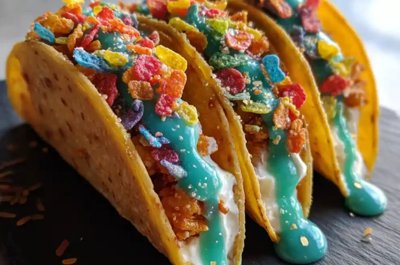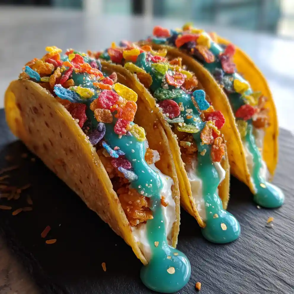 - Glaze & Garnish: Drizzle glaze over chilled tacos and sprinkle with Fruity Pebbles and coconut.