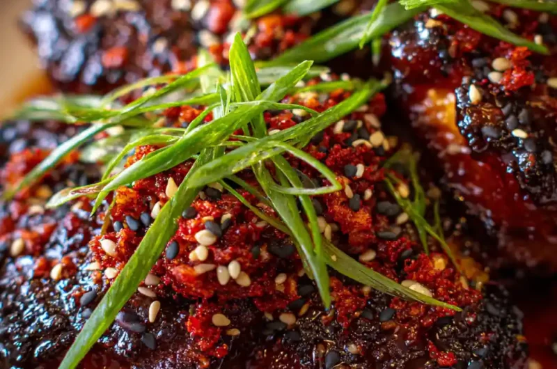 - Glaze and Serve: Once mushrooms are seared, return all slices to the skillet. Pour the prepared gochujang-maple glaze over the mushrooms; gently toss or brush to coat each piece thoroughly. Cook for an additional 1-2 minutes, allowing the glaze to lightly caramelize onto the mushrooms. To plate, arrange the glazed slices artfully, drizzle any remaining glaze, and generously sprinkle with the kimchi-sesame crumble and thinly sliced green onions.