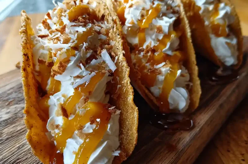 Indulge in Mango-Infused Cheesecake Tacos, a delightful fusion of creamy cheesecake, tangy mango, and a fragrant cardamom cream, all nestled in a crispy corn taco shell. This dessert is perfect for parties or a unique treat for any occasion.