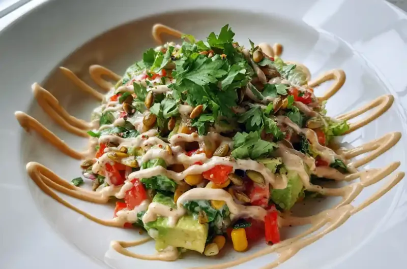 - Plate and Garnish: Spread the salad in a loose mound on a plate, creating a shallow well in the center. Drizzle the reserved crema in a decorative spiral over the top. Sprinkle with toasted pepitas and chopped cilantro. A few lime zest shavings add a bright, fresh finish.