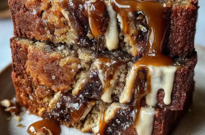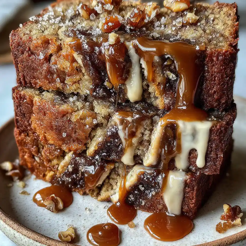A rich, moist banana nut bread featuring a complex brown butter date swirl. The combination of toasted brown butter and caramel dates elevates this classic loaf, making it perfect for sharing or enjoying as a family snack.