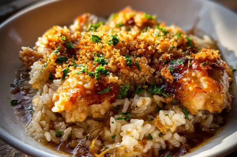 Enjoy a comforting and flavorful One Pot French Onion Chicken Rice, featuring tender chicken, sweet caramelized onions, fluffy rice, and a crispy Parmesan crumble. This recipe delivers the essence of French onion soup in an easy, weeknight-friendly format.