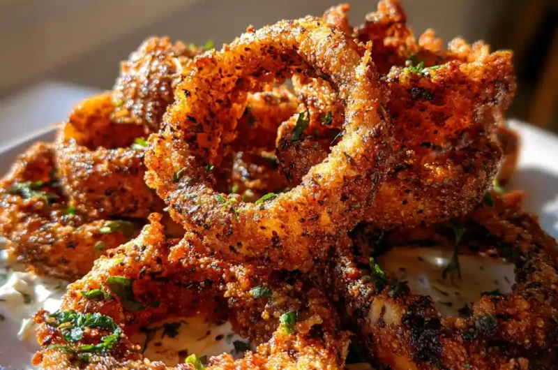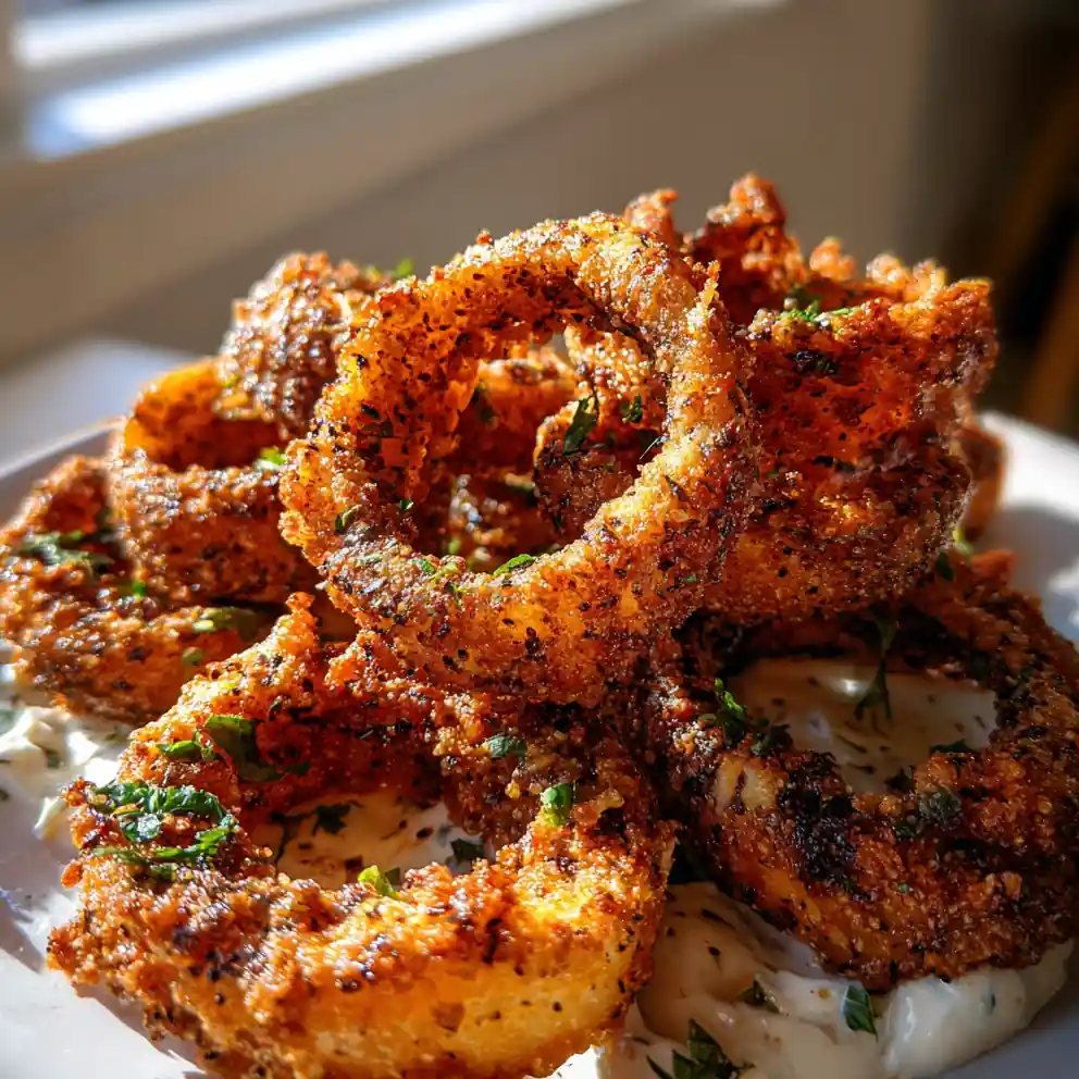 6. Serve Immediately: Transfer the crispy onion rings to a platter and serve immediately while hot, alongside the Lemon-Herb Yogurt Dip.