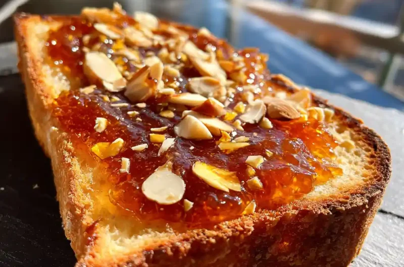- Honey Swirl and Almond Garnish: Immediately drizzle 2 tbsp of honey over the surface of each jar of hot jam. Use a thin skewer or knife to gently swirl the honey through the jam, creating beautiful ribbons. While the jam is still warm, sprinkle 50g (½ cup) of coarsely chopped toasted sliced almonds over the honey-swirled surface. The almonds will adhere to the jam as it cools.