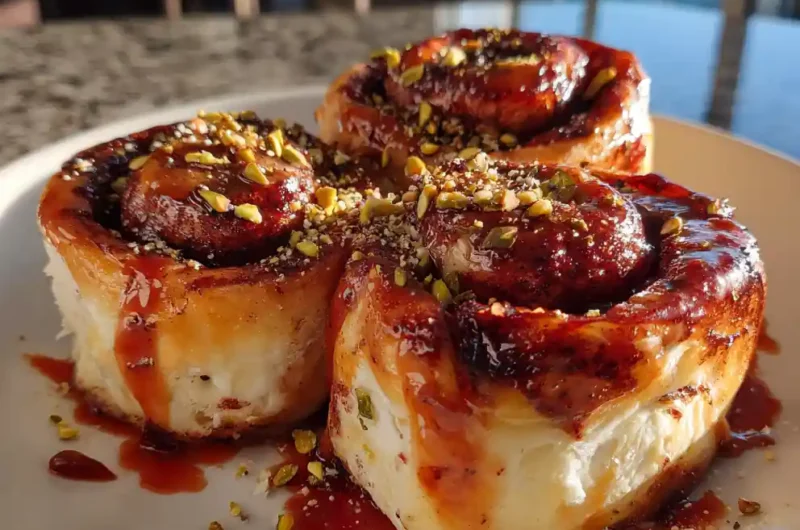 12. Glaze and Garnish: Remove the rolls from the oven and let them cool on the baking sheet for 5 minutes. Drizzle the warm raspberry glaze generously over each roll. Sprinkle with toasted chopped pistachios for added color, texture, and a subtle nutty flavor.