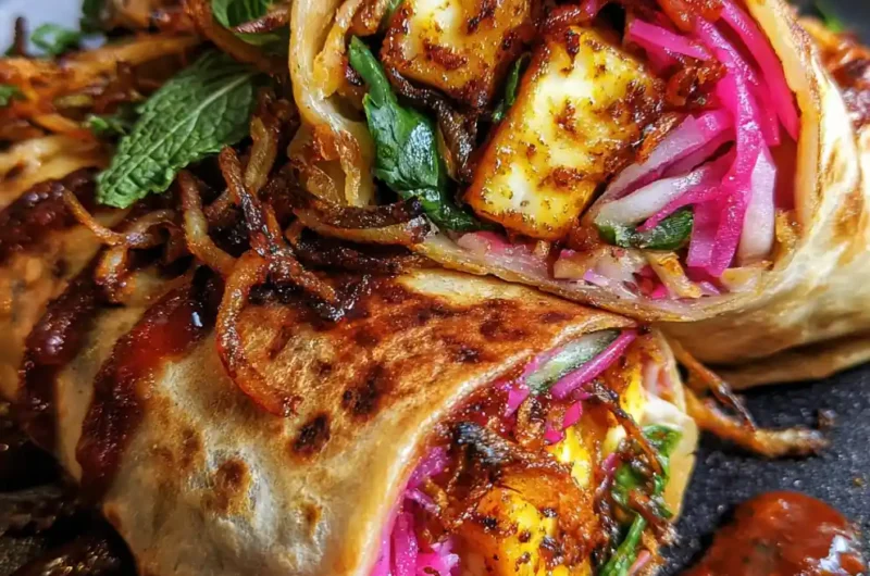 - Assemble Kathi Rolls: Lay a warm paratha flatbread on a clean surface. Spread 2-3 tbsp of the prepared Smoky Tomato-Mint Chutney. Spoon a portion of the paneer filling down the center. Top with the Quick Sumac Pickled Red Onions and crispy fried shallots. Roll the paratha tightly from one end to the other and serve immediately.