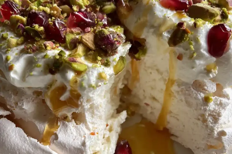 - Assemble Your Pavlova Recipe (5-10 min): Once pavlova is cool, transfer to platter. Spoon whipped cream into center. Scatter toasted pistachios and fresh pomegranate arils. Drizzle saffron syrup generously for a striking finish to your pavlova recipe.
