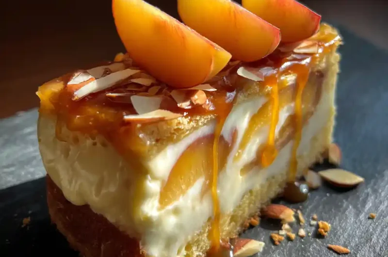 14. Glazing and Garnishing: Once the cake is at room temperature, drizzle the warm caramelized peach glaze over the top, allowing it to cascade down the sides. Scatter the toasted sliced almonds over the glaze and arrange the thin peach slices decoratively on top.