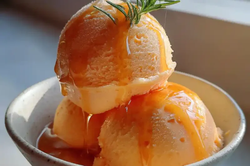 A vibrant and refreshing peach sorbet made from fresh fruit and a sugar syrup base, ensuring a perfectly smooth texture. It’s elegantly enhanced with an aromatic rosemary-infused honey drizzle, making it ideal for summer entertaining.