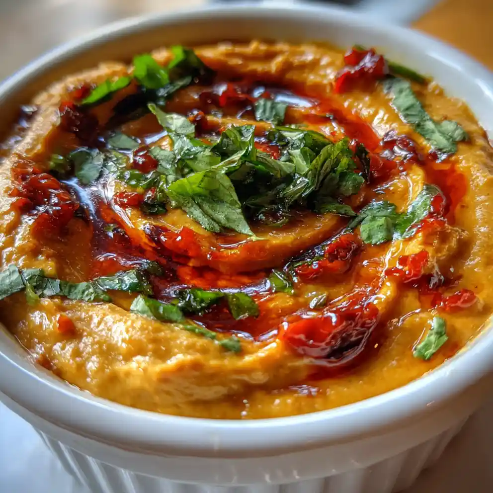 4. Swirl and Temper: Transfer creamy peanut chutney to a shallow serving bowl. Dollop spoonfuls of the smoky roasted red pepper and tomato paste over the surface. Using the back of a spoon, gently swirl the red paste into the peanut chutney, creating distinct ribbons without fully mixing. Heat the remaining 1 tablespoon vegetable oil over medium heat. Add the remaining 0.25 teaspoon cumin seeds and mustard seeds. Once mustard seeds splutter and pop, add fresh curry leaves and asafoetida. Saute for 30 seconds until curry leaves are crisp and fragrant.