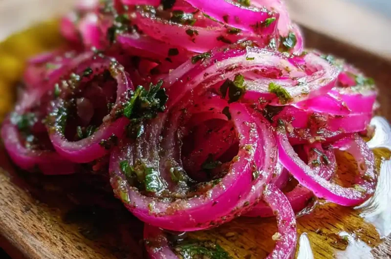 I am always searching for ways to add big flavor to simple meals without much fuss. These quick pickled onions are a total game-changer for weeknights, delivering a vibrant pink color and tangy crunch to everything from tacos to salads in a flash. This quick pickled onion recipe bypasses the long wait time of traditional methods by using a hot brine, so you get tender, ready-to-eat onions in just 30 minutes. The real secret here is the glossy sumac and herb coating we add at the end; it transforms these onions into a bright, tangy condiment that elevates a simple family meal. It’s the perfect shortcut for busy home cooks who want maximum impact with minimal effort.