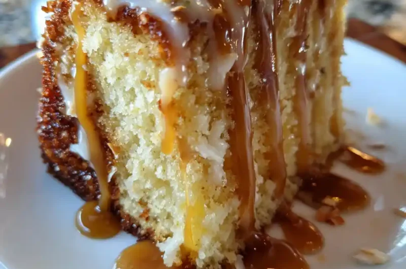 - Cool & Finish: Cool in pan, invert, and garnish with caramel and toasted coconut.