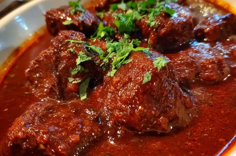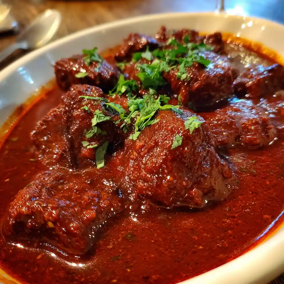 The distinctive brick red color comes from rehydrated and blended ancho chiles and the tomato base. The long, slow simmer deepens these hues.